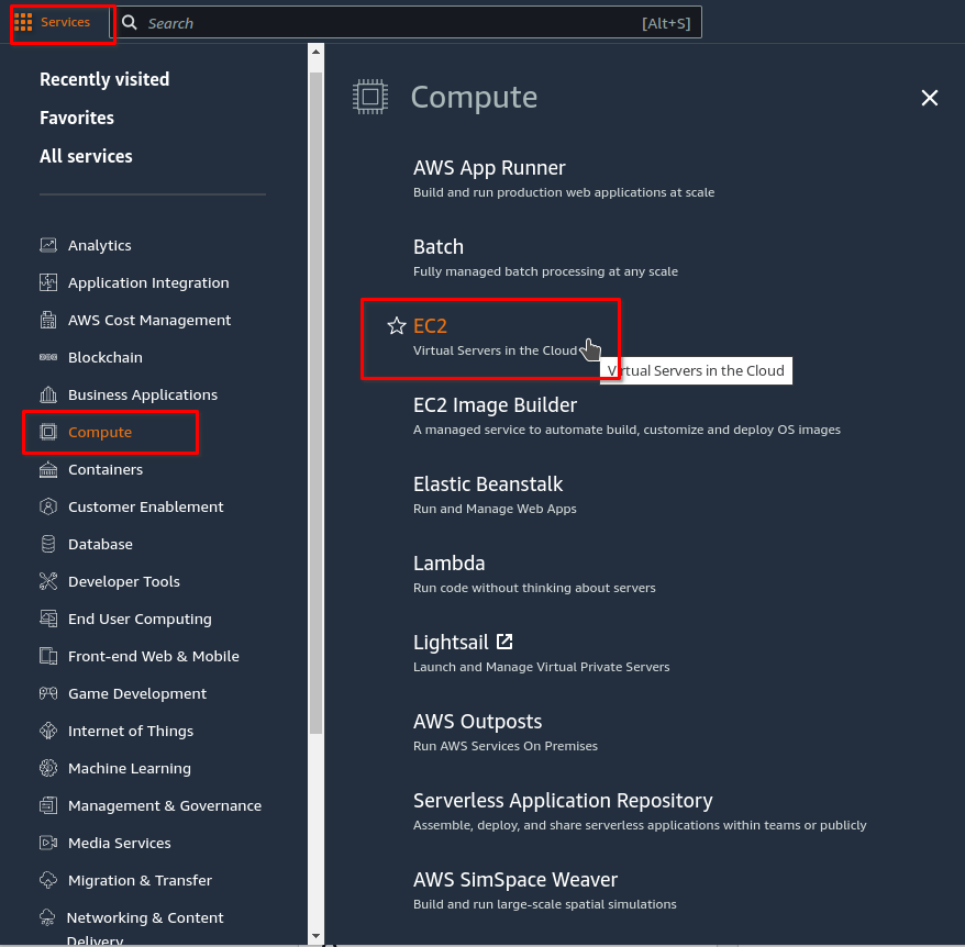 - Go to Services > Compute > EC2 to access the EC2 section in AWS. This is where you'll create and manage your virtual machine instances.