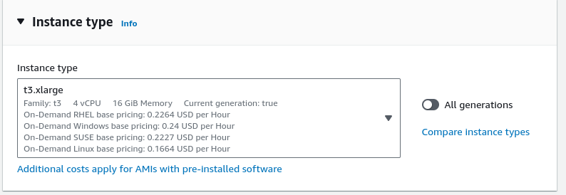 - Choose Instance type: t3.xlarge (or any other suitable instance type, check node requirements for guidance).