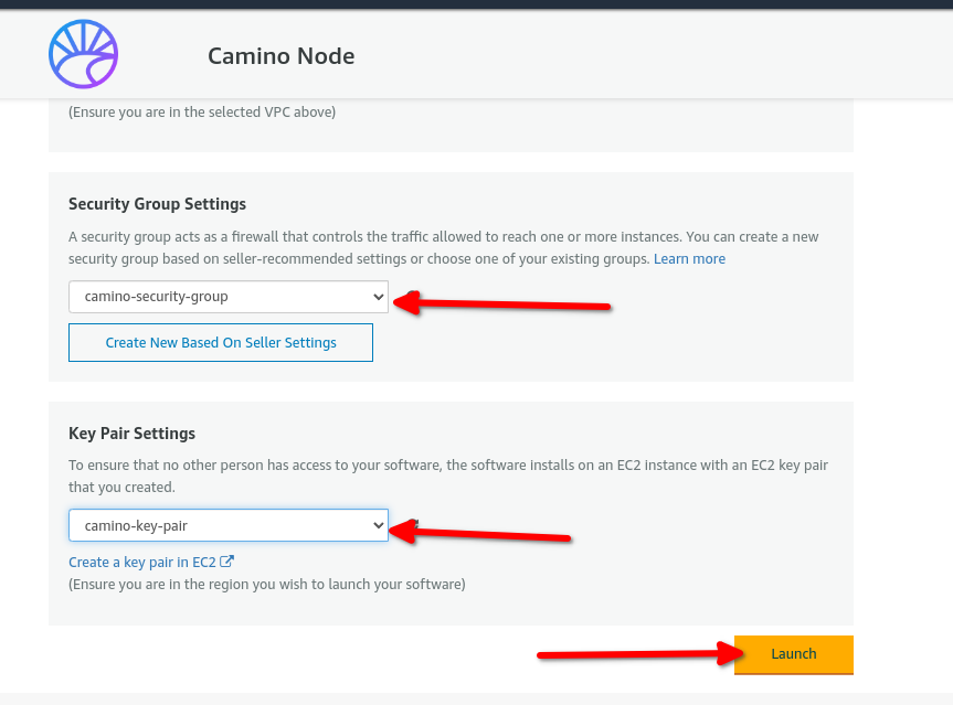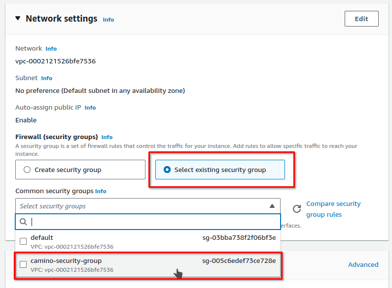 - Under "Network Settings," choose "Select an existing security group" and select the security group you created earlier from the list. This will apply the inbound rules you set for SSH and Camino TCP ports.