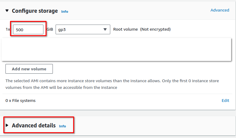 - Under "Configure storage," set the size to 500 GB with gp3 for the storage type.