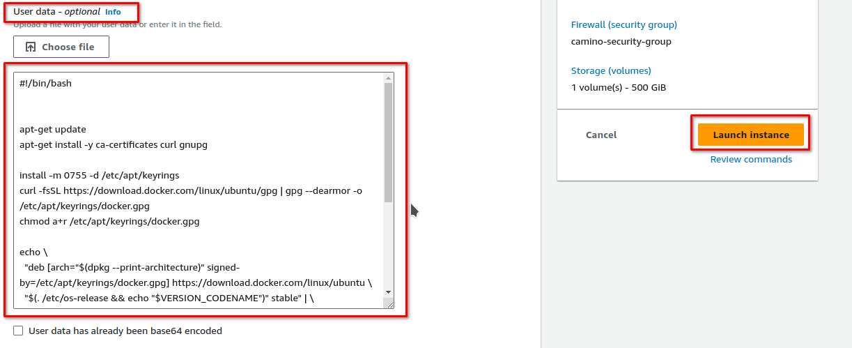 Under "User data," add the startup script provided below. This script will be executed when the instance starts and set up the necessary components for running Camino Node.