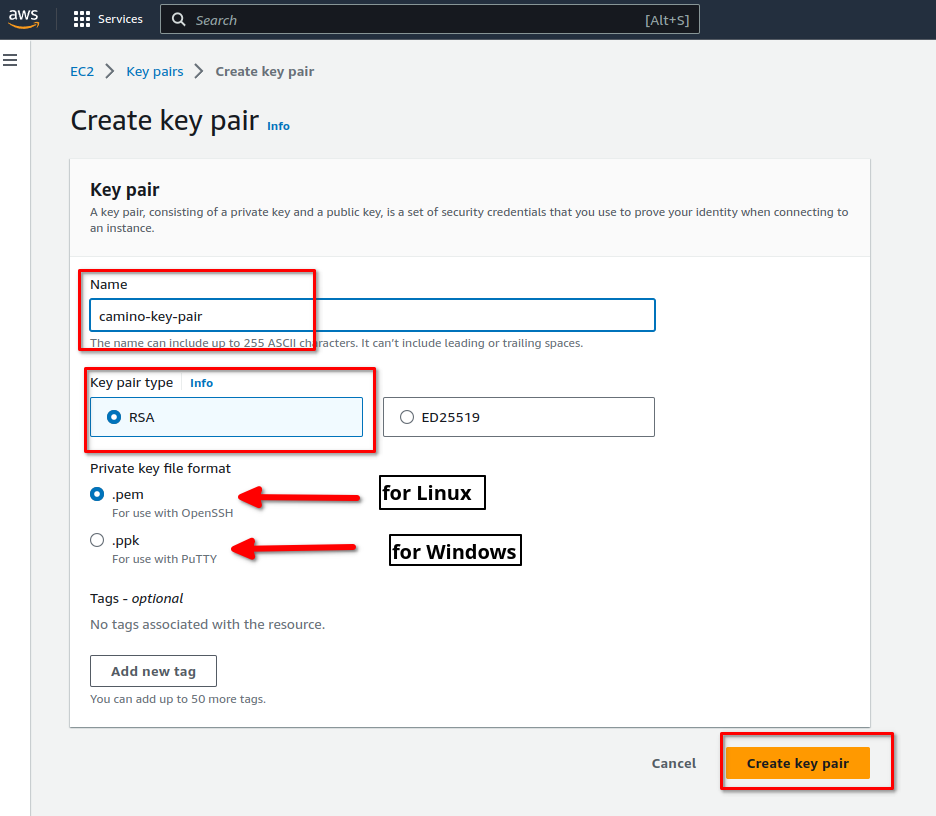 - Select .pem if you use Linux or .ppk if you use Windows to download the key pair.