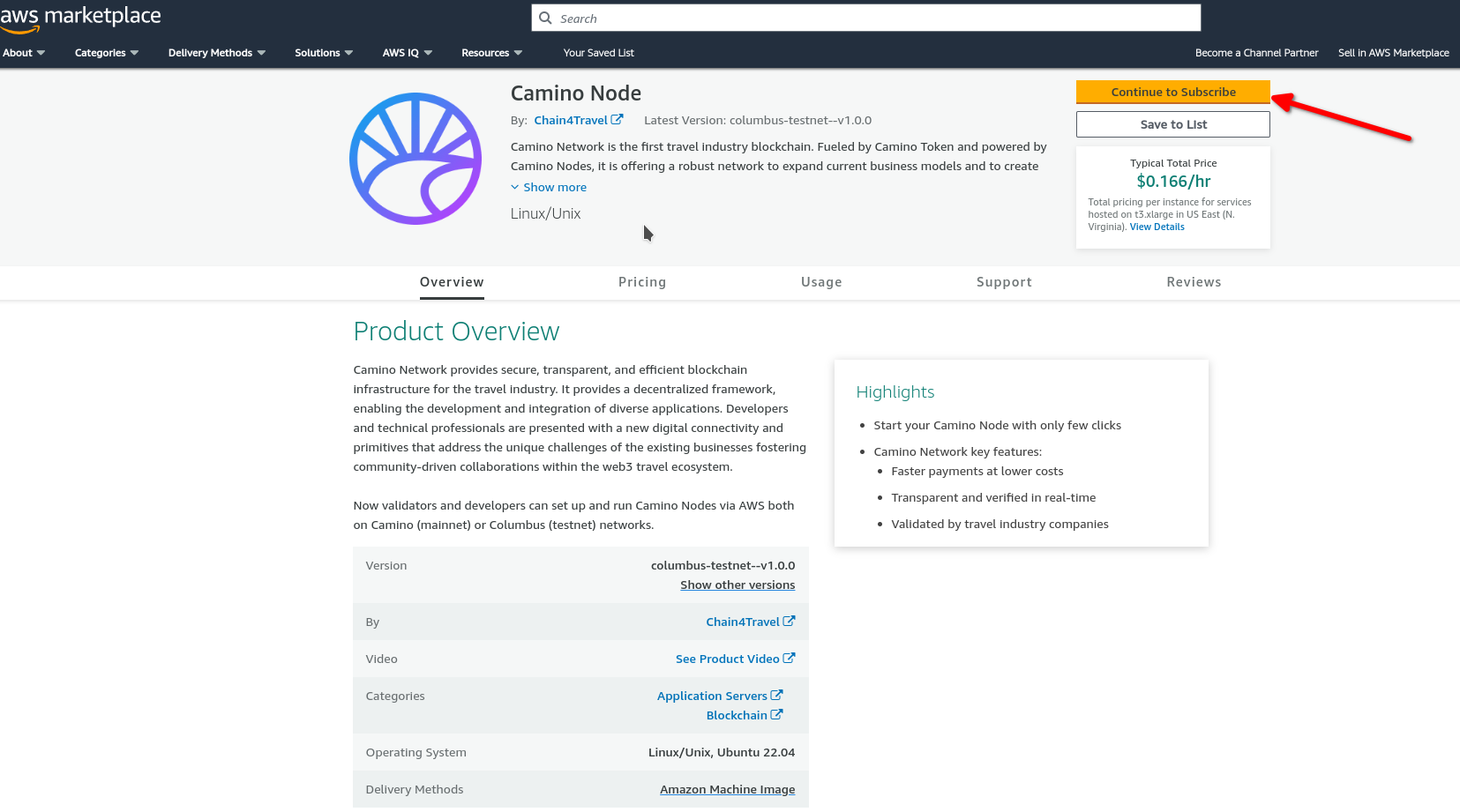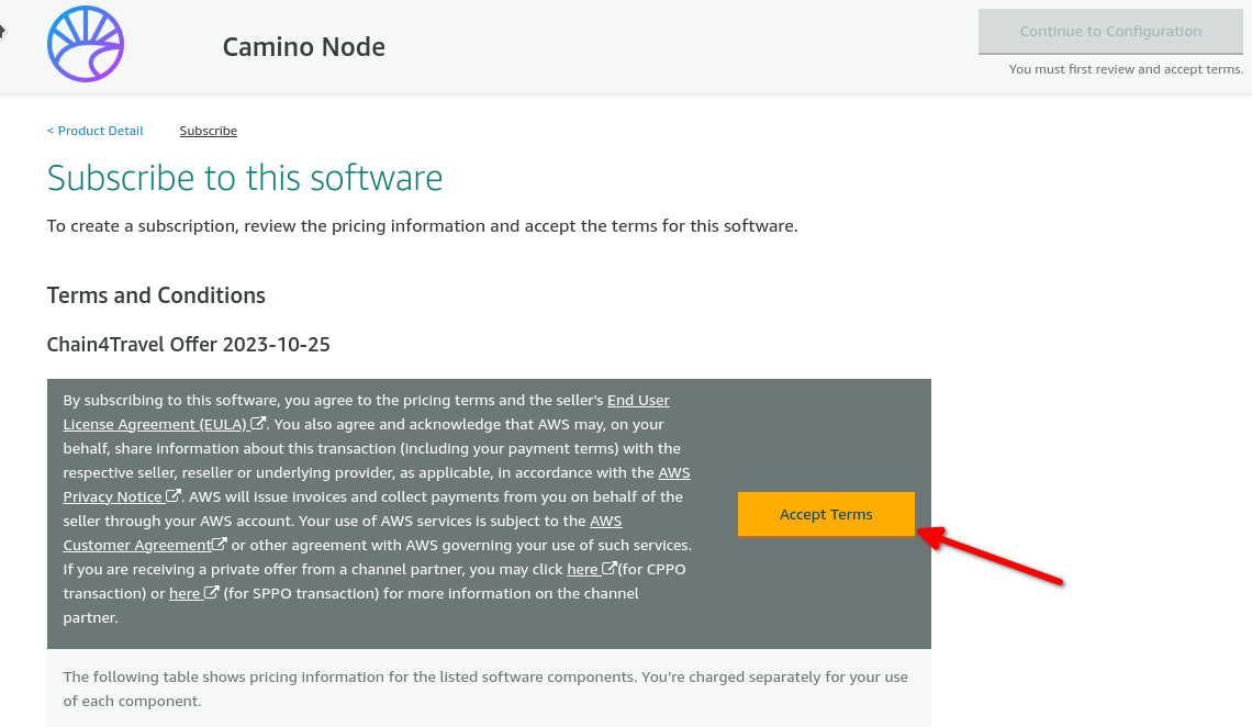 Access the "Camino Node" product page and click on "Continue to Subscribe".