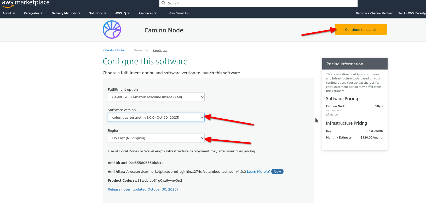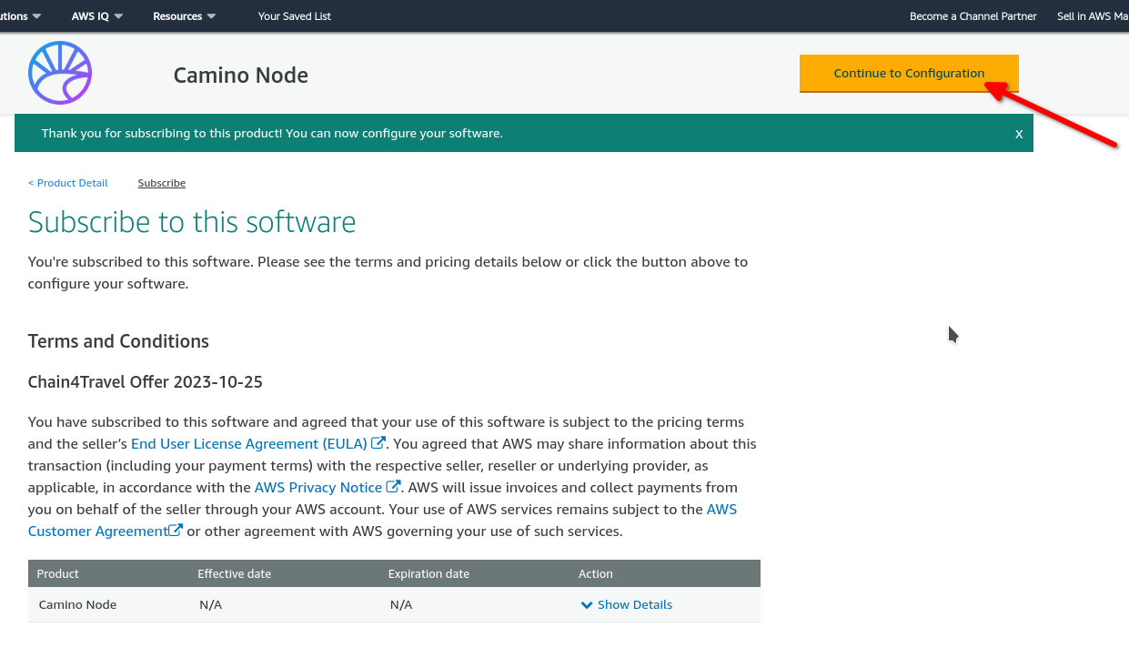 If you are already subscribed to the "Camino Node" product, you can skip steps 3-6 and proceed directly to step 7.
