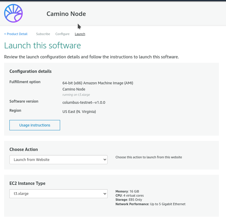 The Camino Node will soon be available on the AWS Marketplace. This section of the documentation is prepared in anticipation of its release, fulfilling a requirement by Amazon. The steps outlined here are for your early reference.