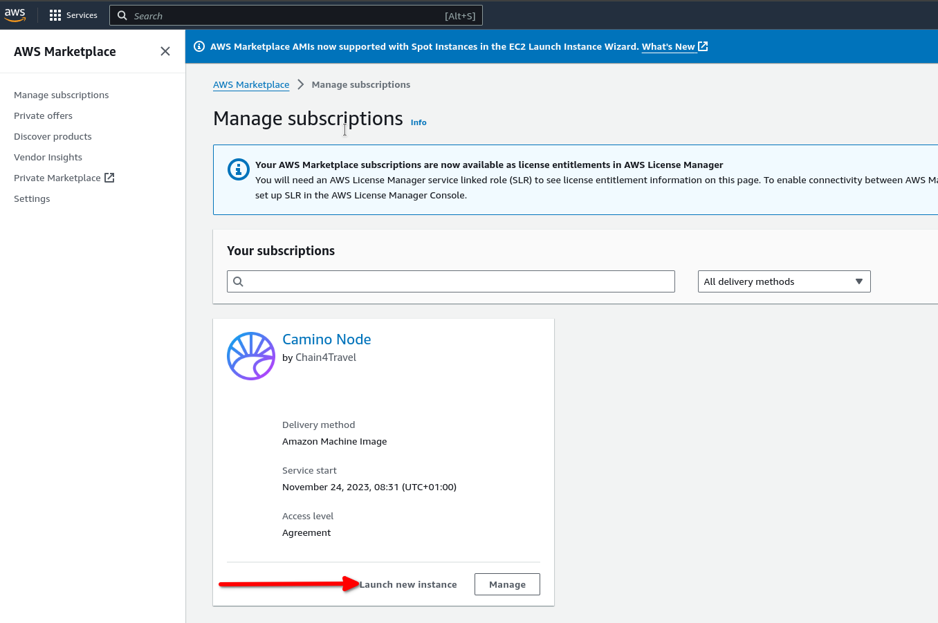 Navigate to your marketplace subscriptions and select "Launch new instance" for the "Camino Node" product.