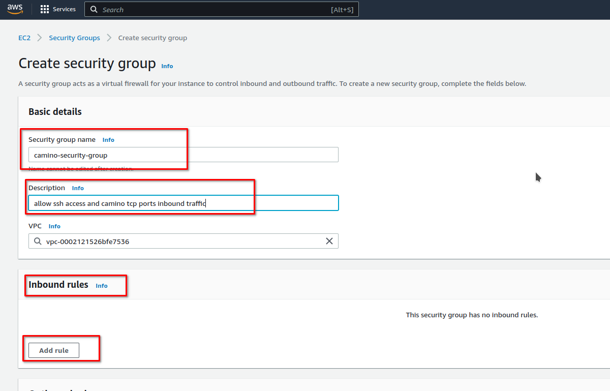 Write a description, e.g., "Allow inbound traffic for SSH port and Camino TCP ports".