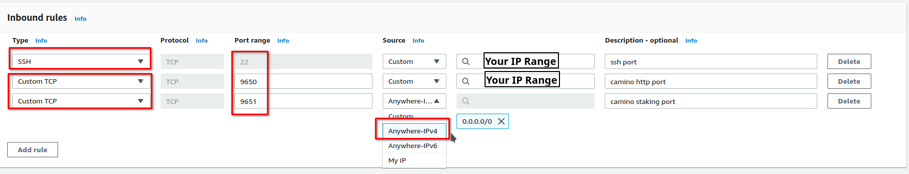 - IP Range: 0.0.0.0/0 (to allow staking port access from any IP)