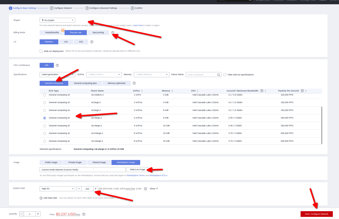 - It will open a new browser tab to create ECS instance. Configure Region, Billin Mode, Specifications, Image and System Disk. Note that System Disk must have at least 128 GB. Then click on "Next: Configure Network"