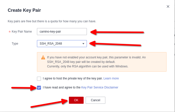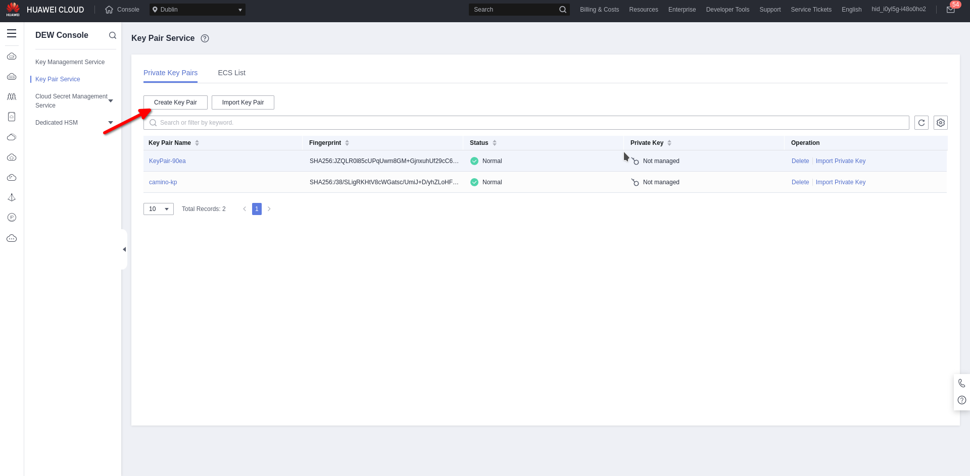 Back to the "ECS Console" Go to "Network & Security" > "Key Pair".