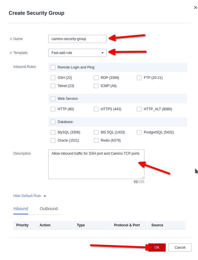 Write a description, e.g., "Allow inbound traffic for SSH port and Camino TCP ports". Then click on "Ok".