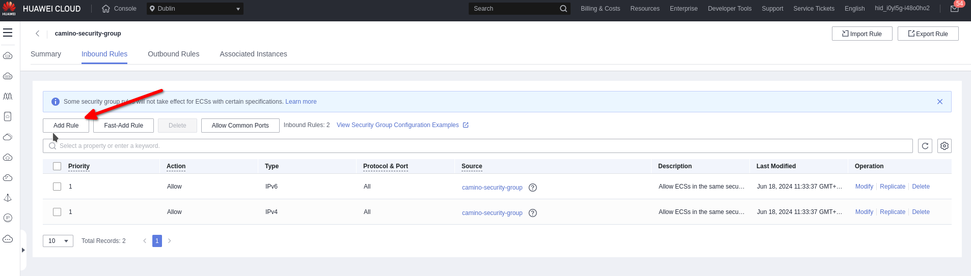Click on "Add Rule", add the following inbound rules, then click "Ok":