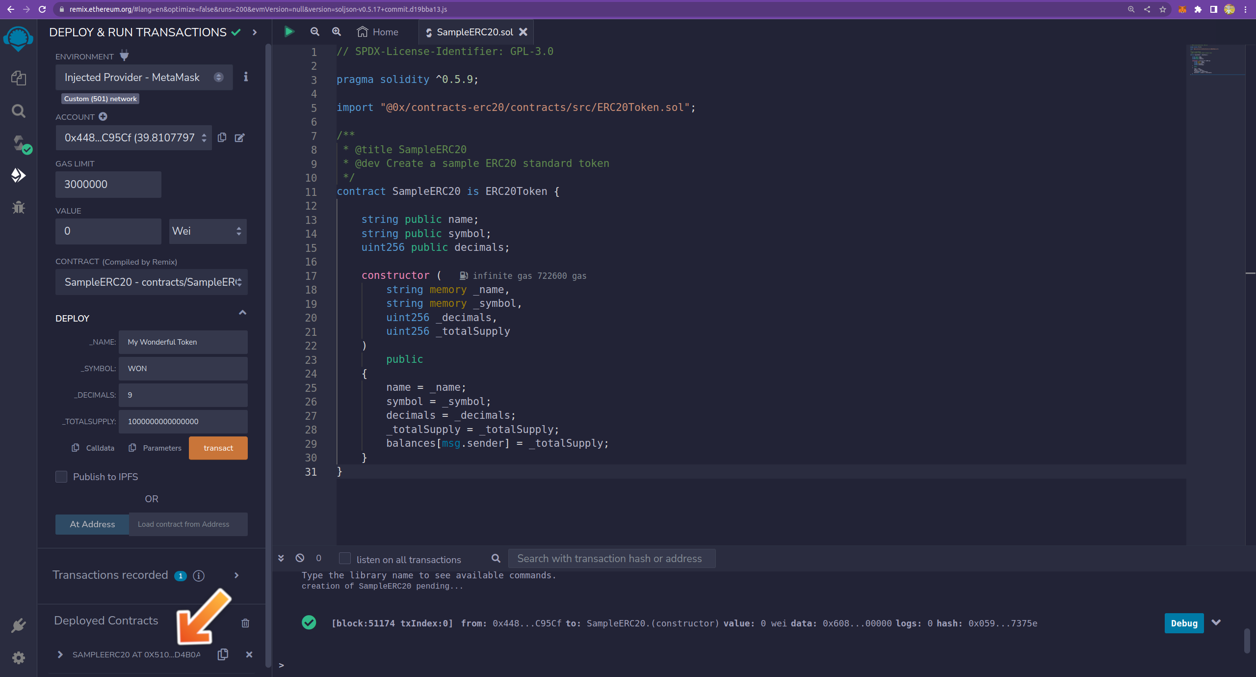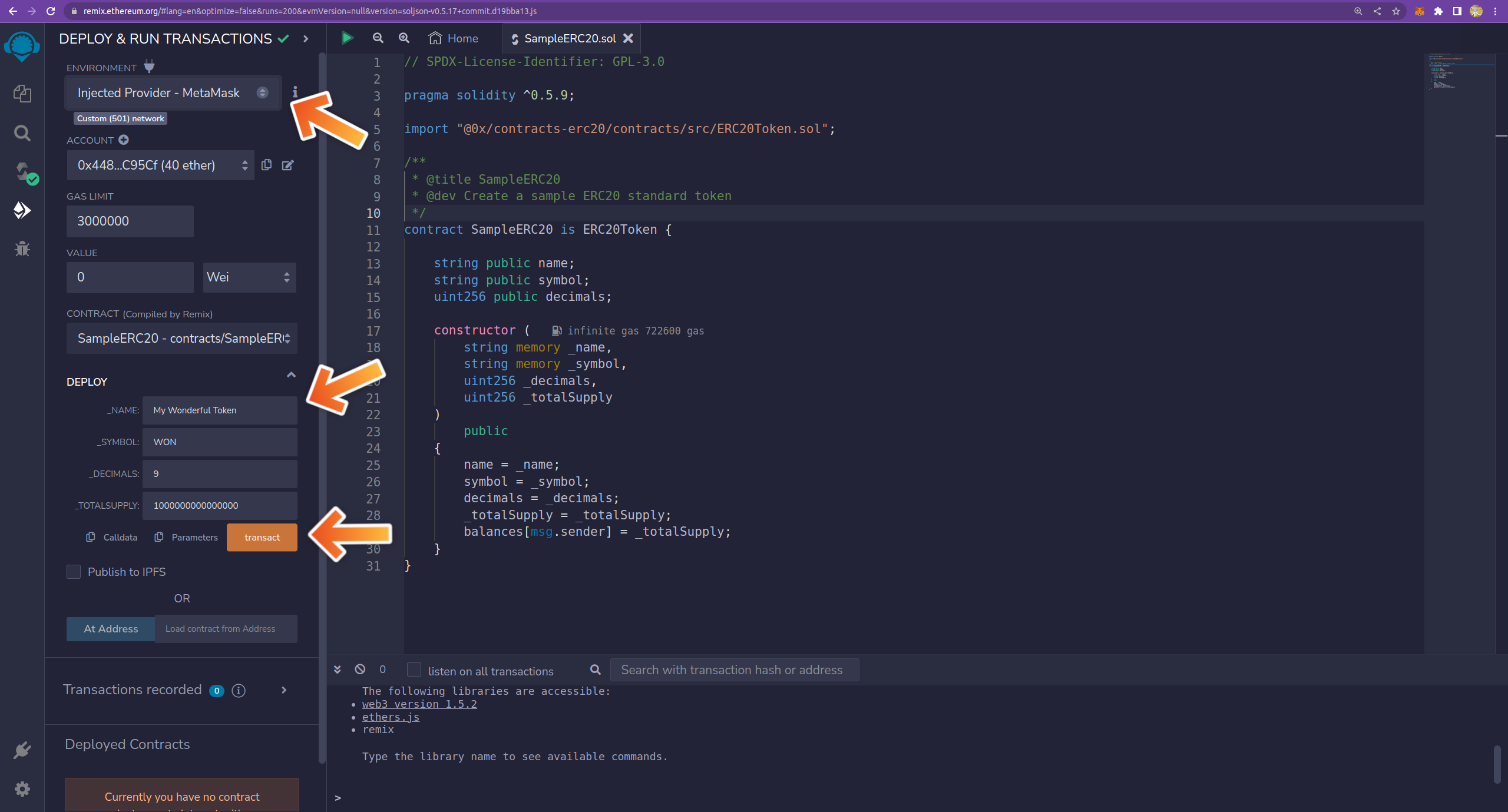 - Enter your desired values for NAME, SYMBOL, DECIMALS, and TOTALSUPPLY.