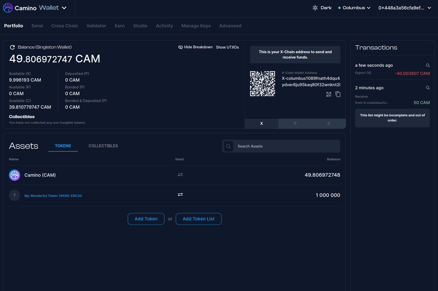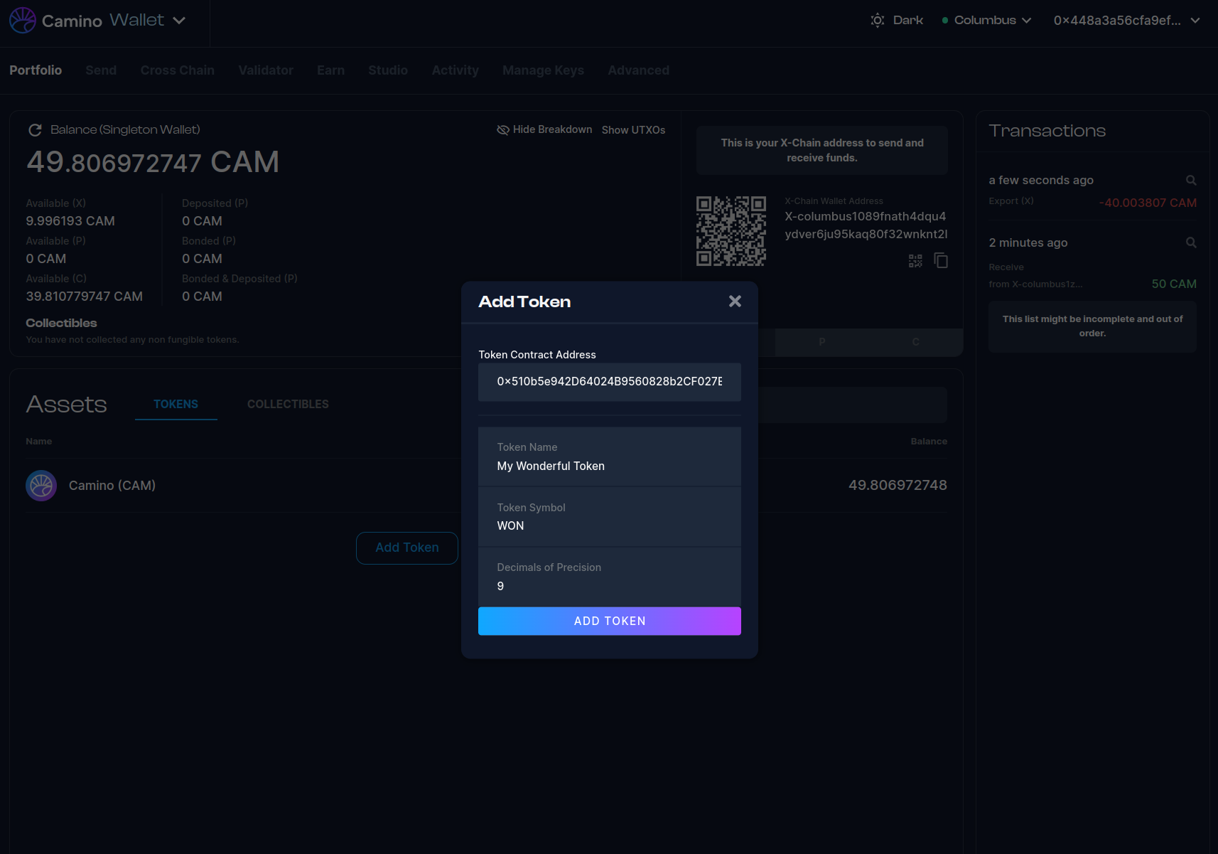 - Add your newly created token to MetaMask and the Camino Wallet.