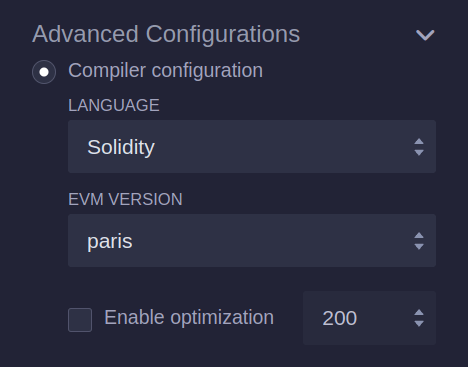 - Click on the drop down menu "Advanced Configurations" and select "paris" as EVM version.