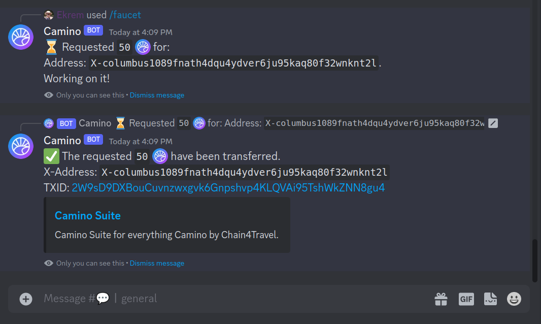 To request funds from the Discord faucet, visit the Camino Discord server and follow the instructions below.