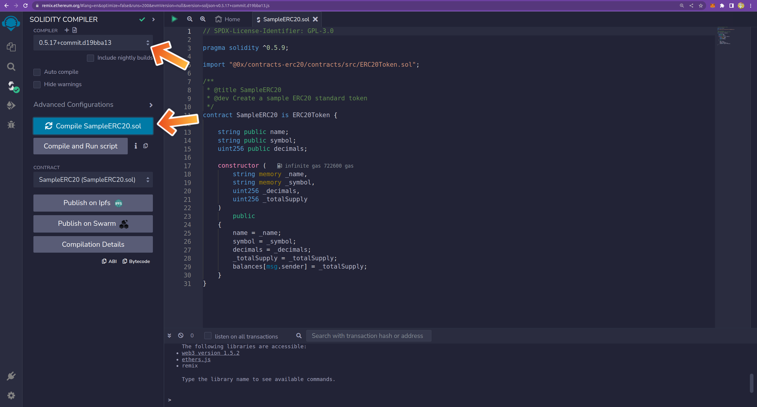 - Click on the "Compile SampleERC20.sol" button to initiate the compilation process.