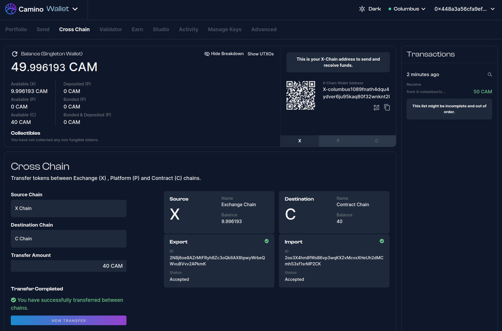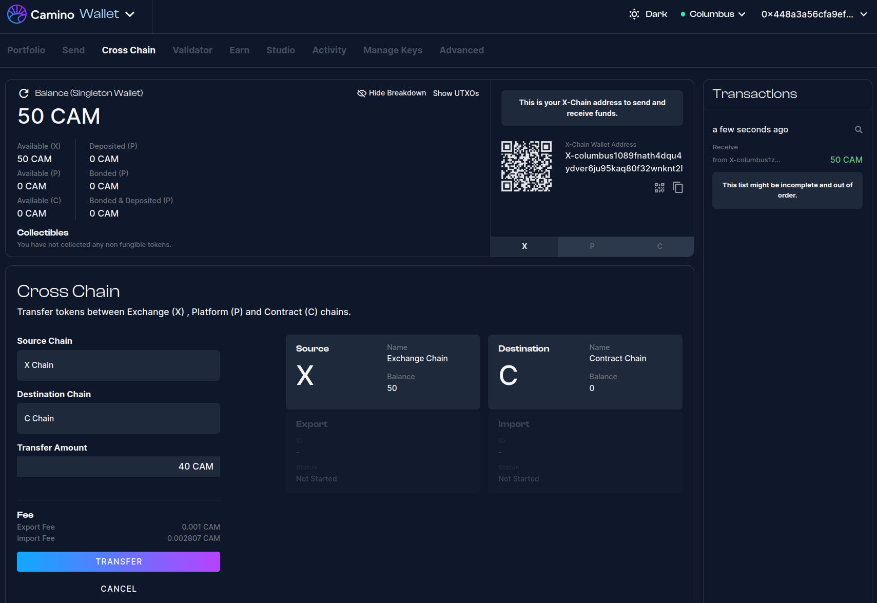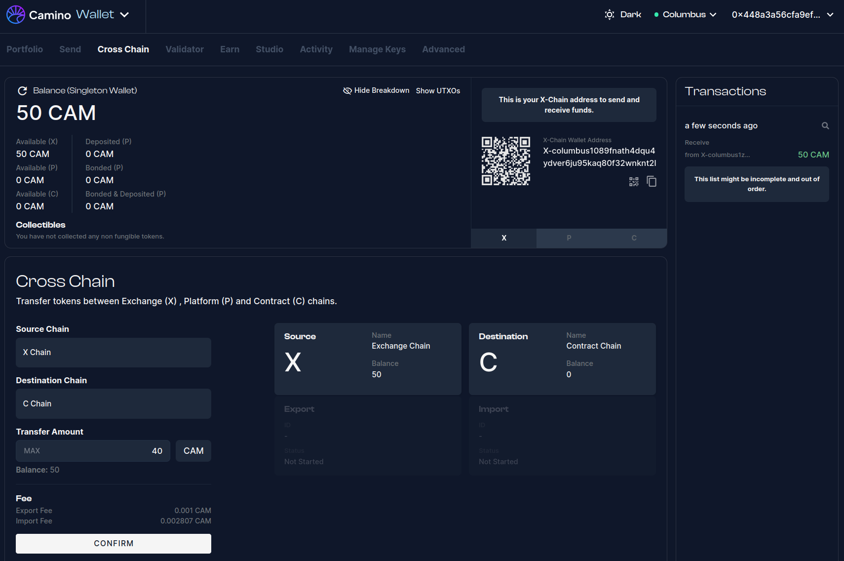 - Click on "Cross Chain" in the navigation bar of the Camino Wallet.