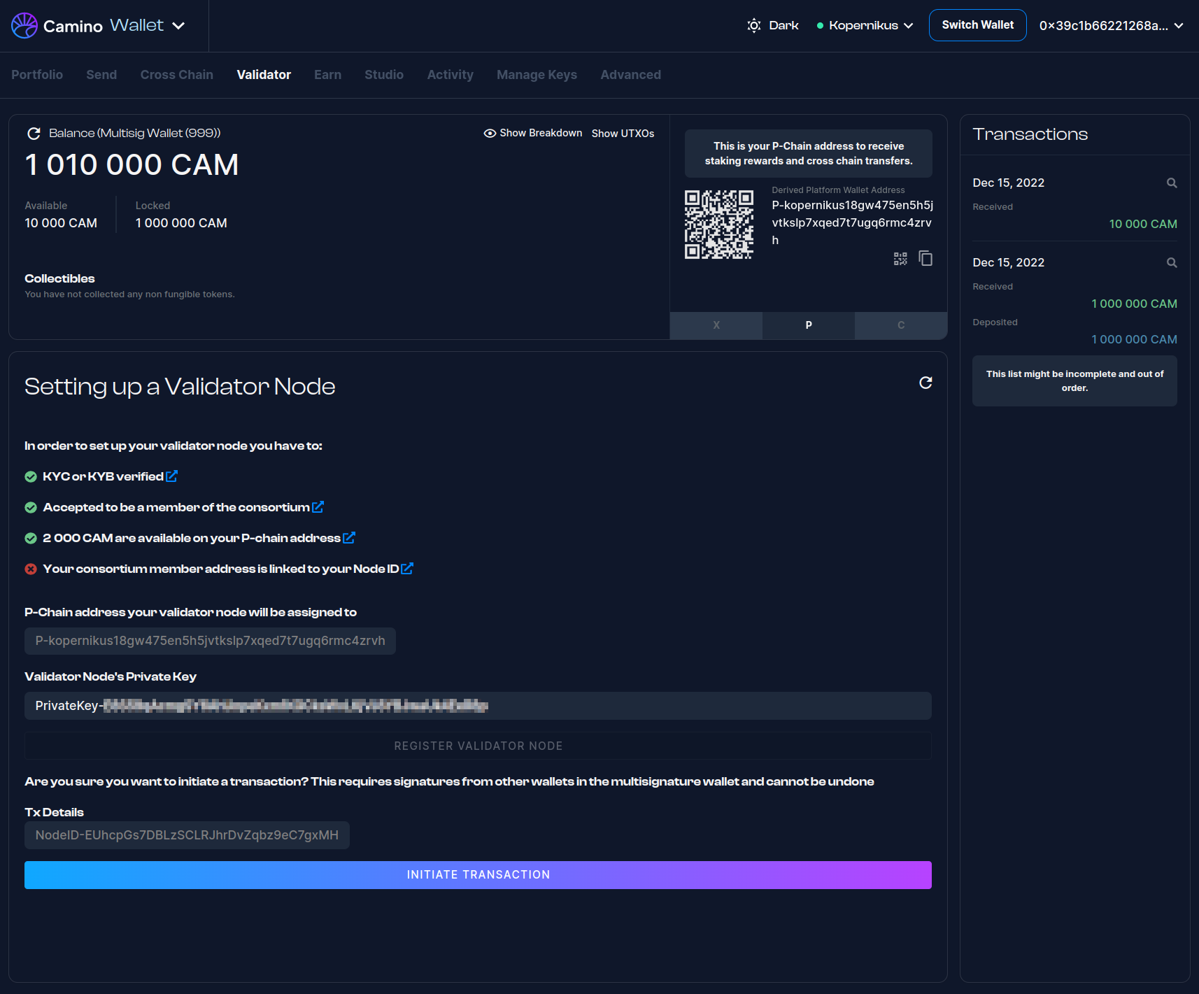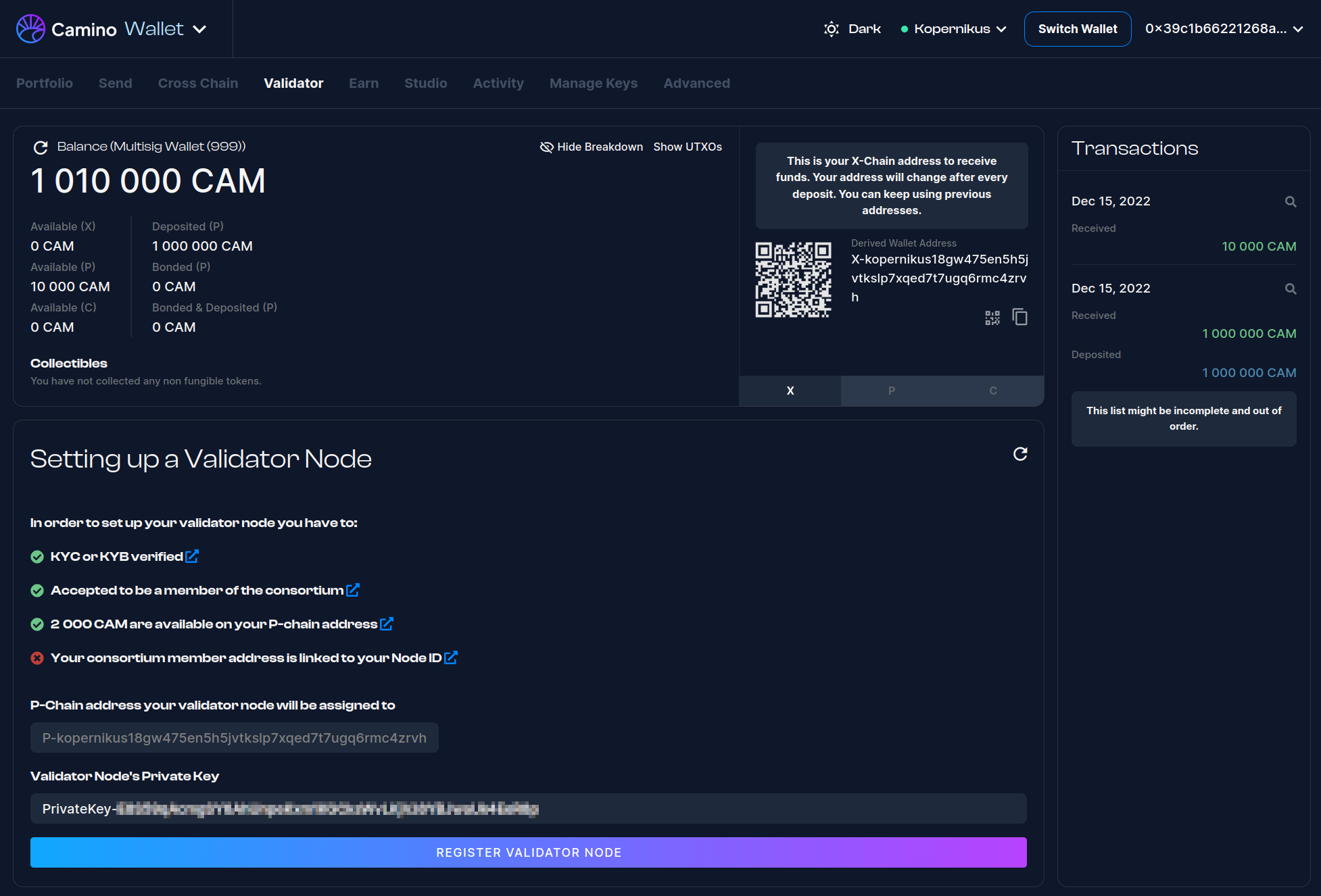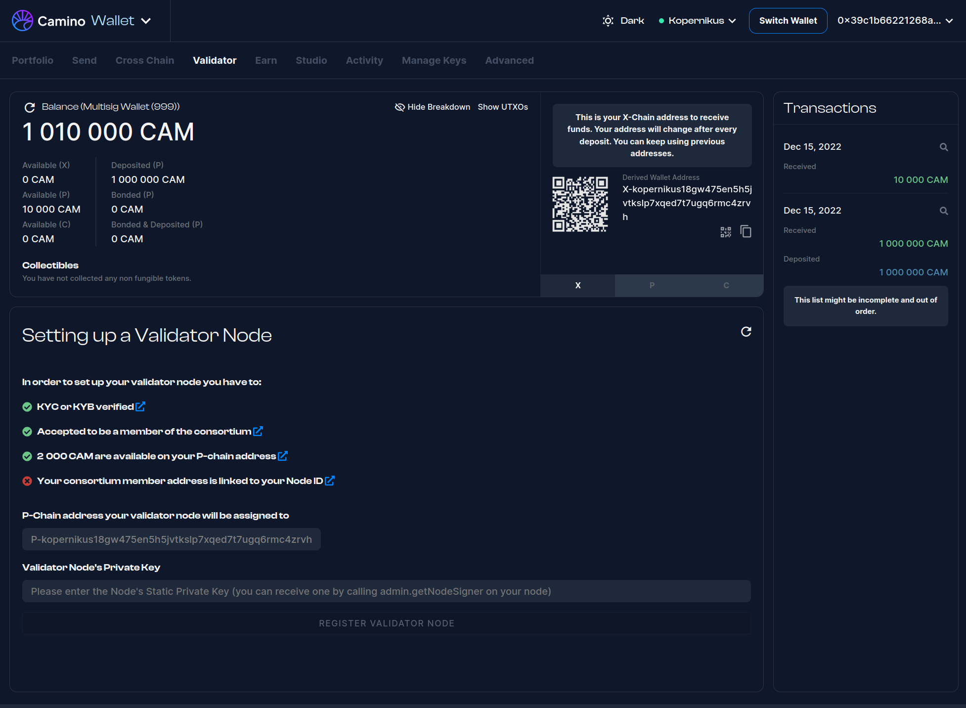 This guide will walk you through the process of adding a validator node using your consortium member address with Camino Wallet.