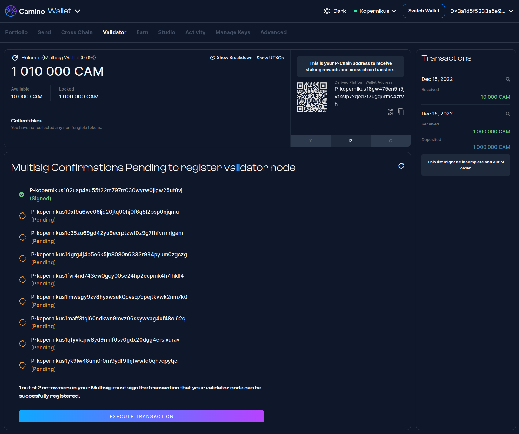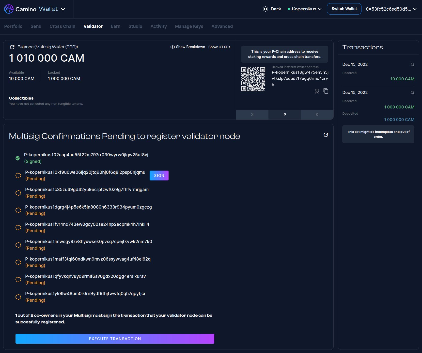 To add a validator node using Camino Wallet and a multisig wallet, you will need to follow these steps: