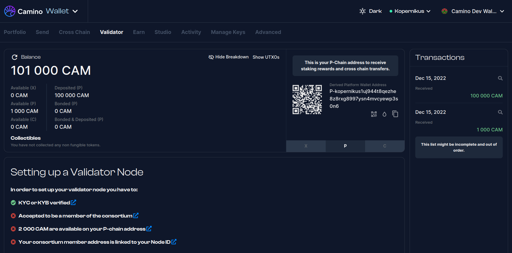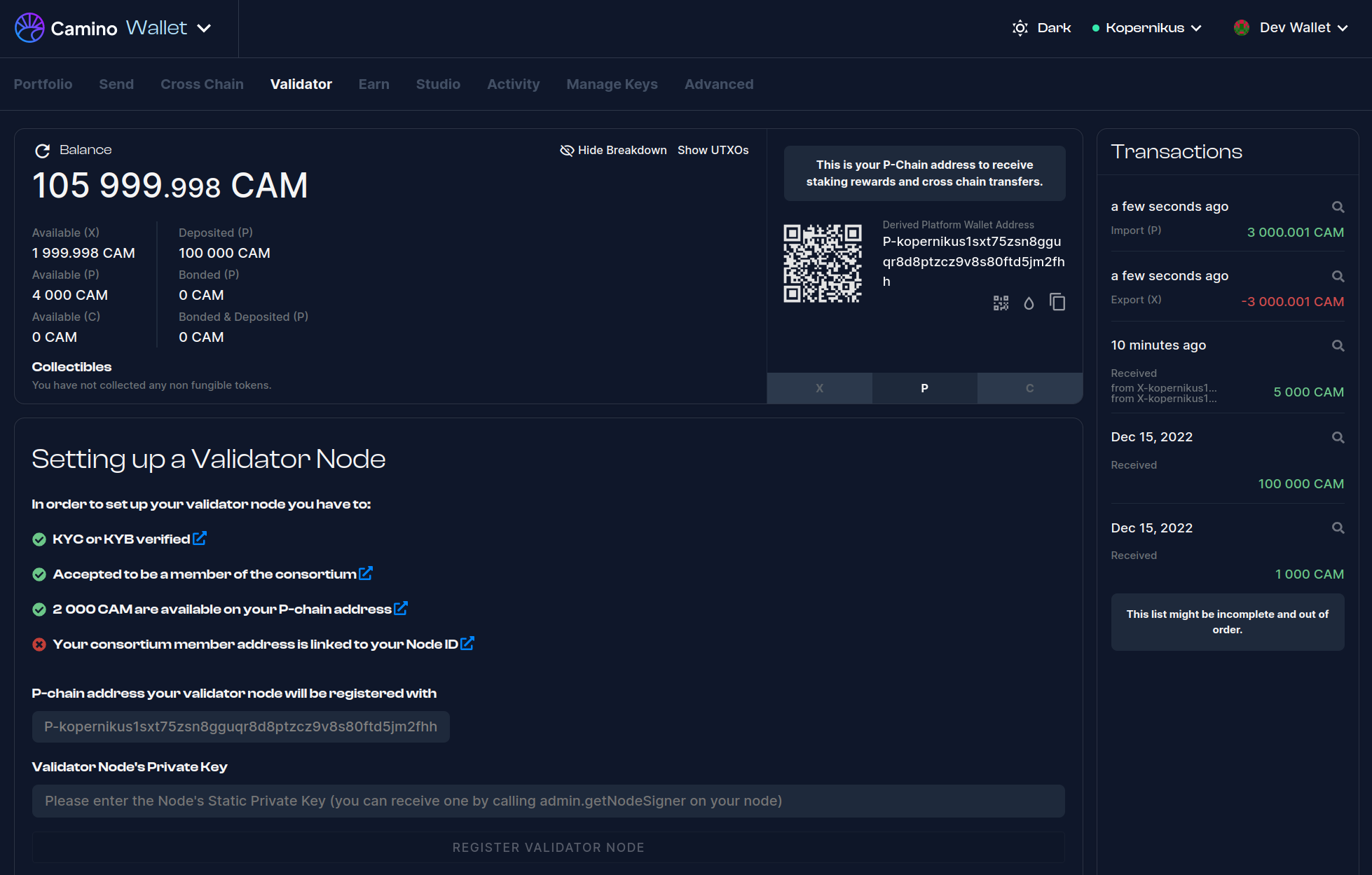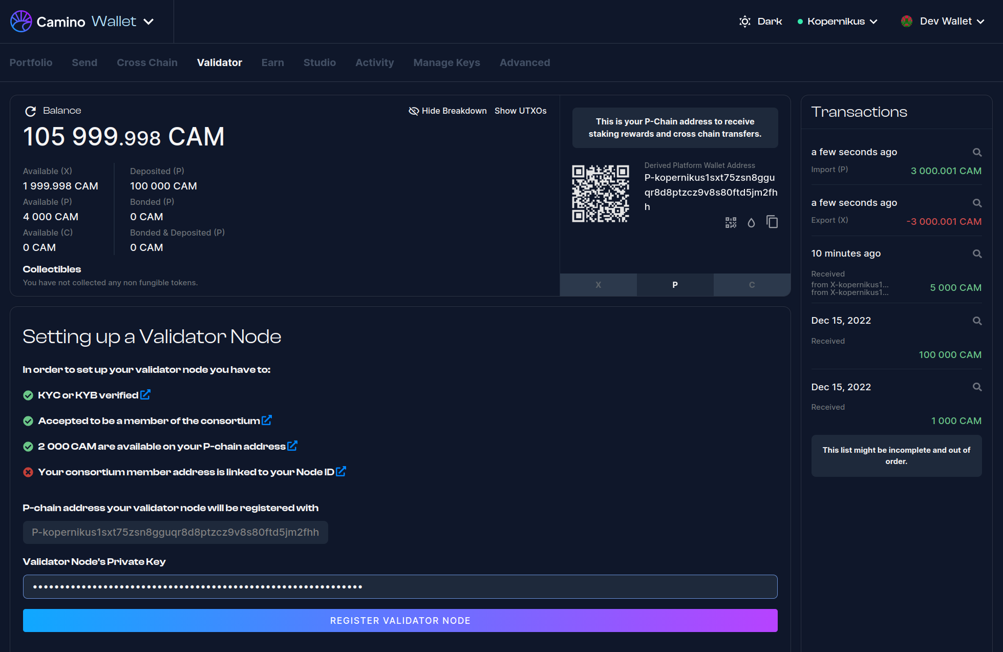 This guide will walk you through the process of adding a validator node using your consortium member address with Camino Wallet.