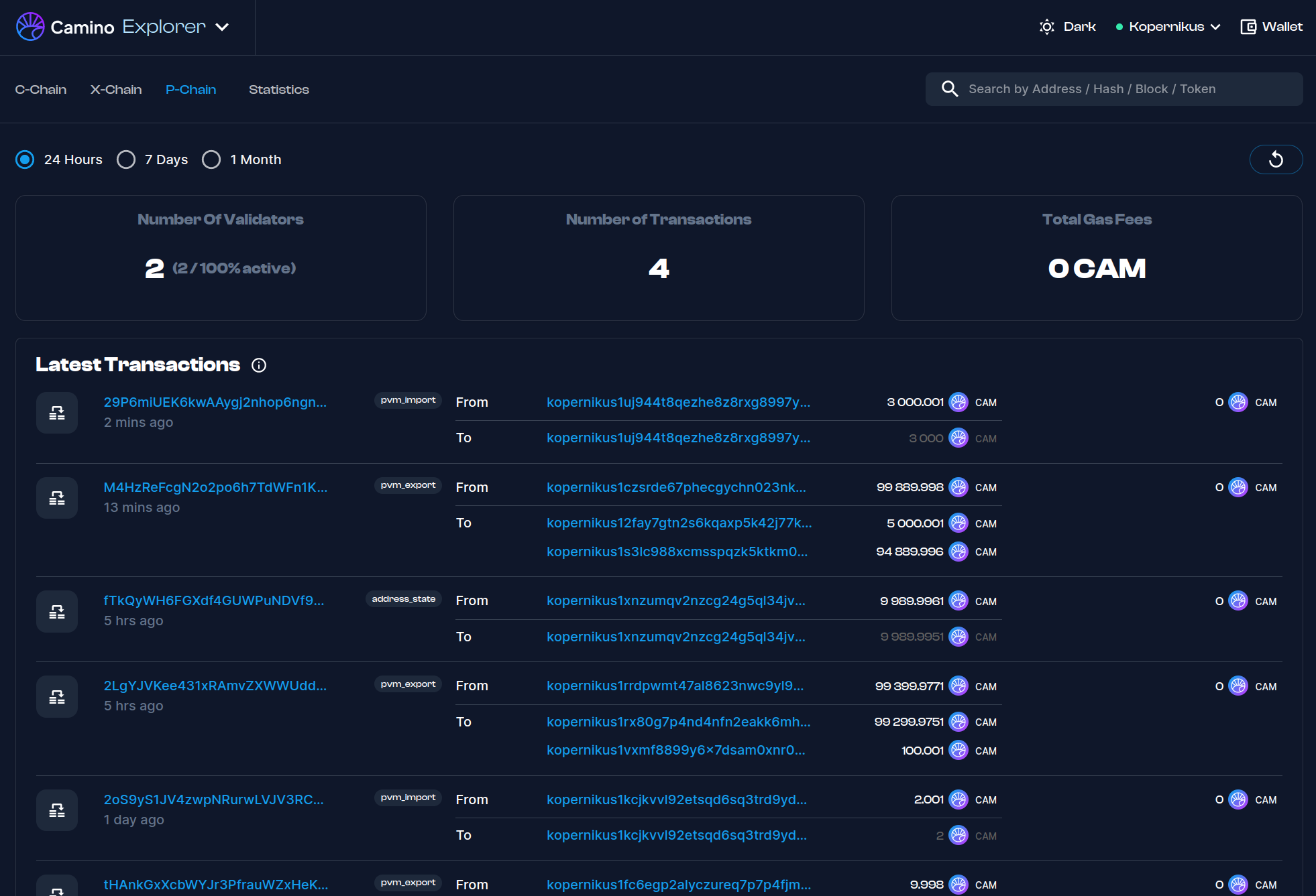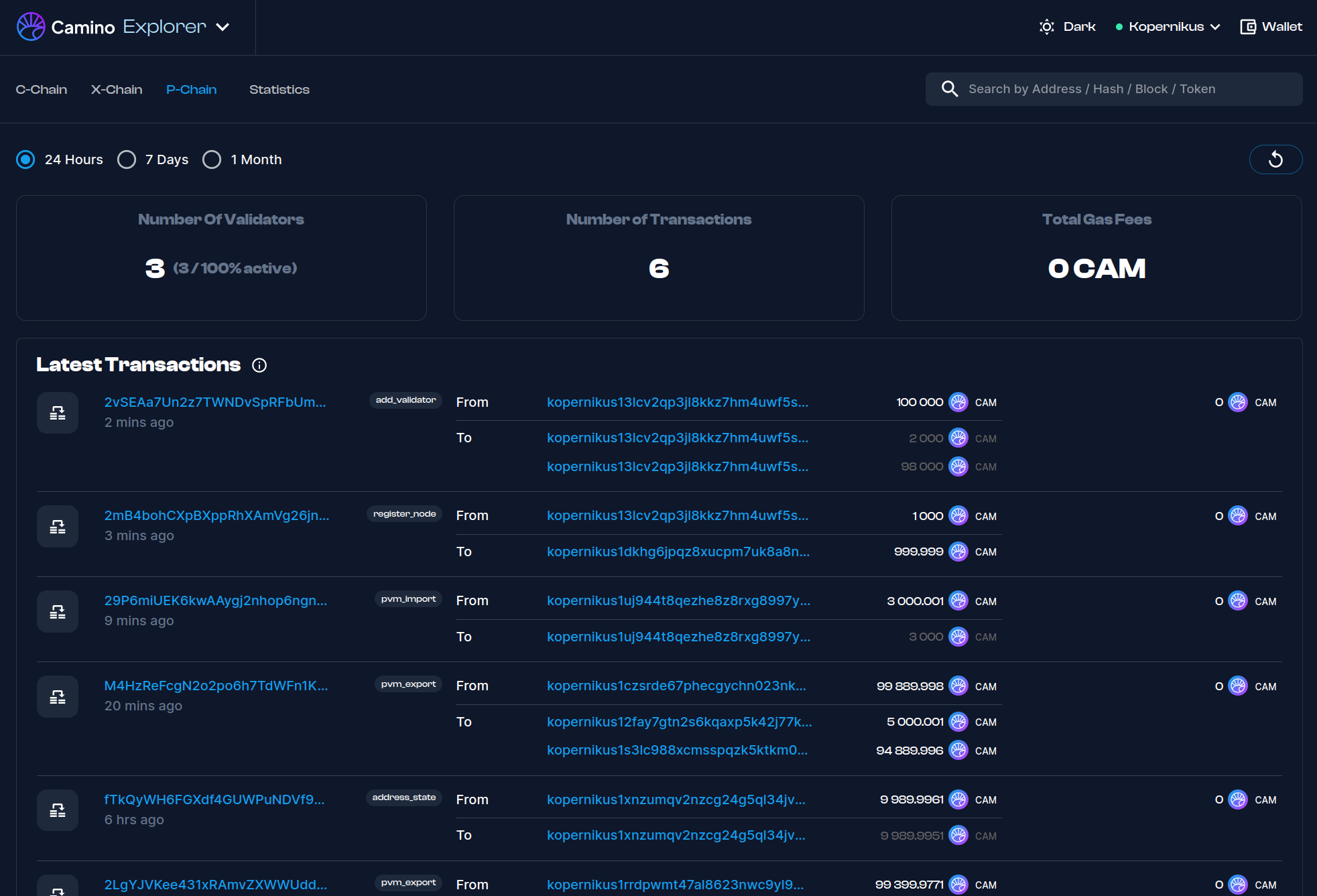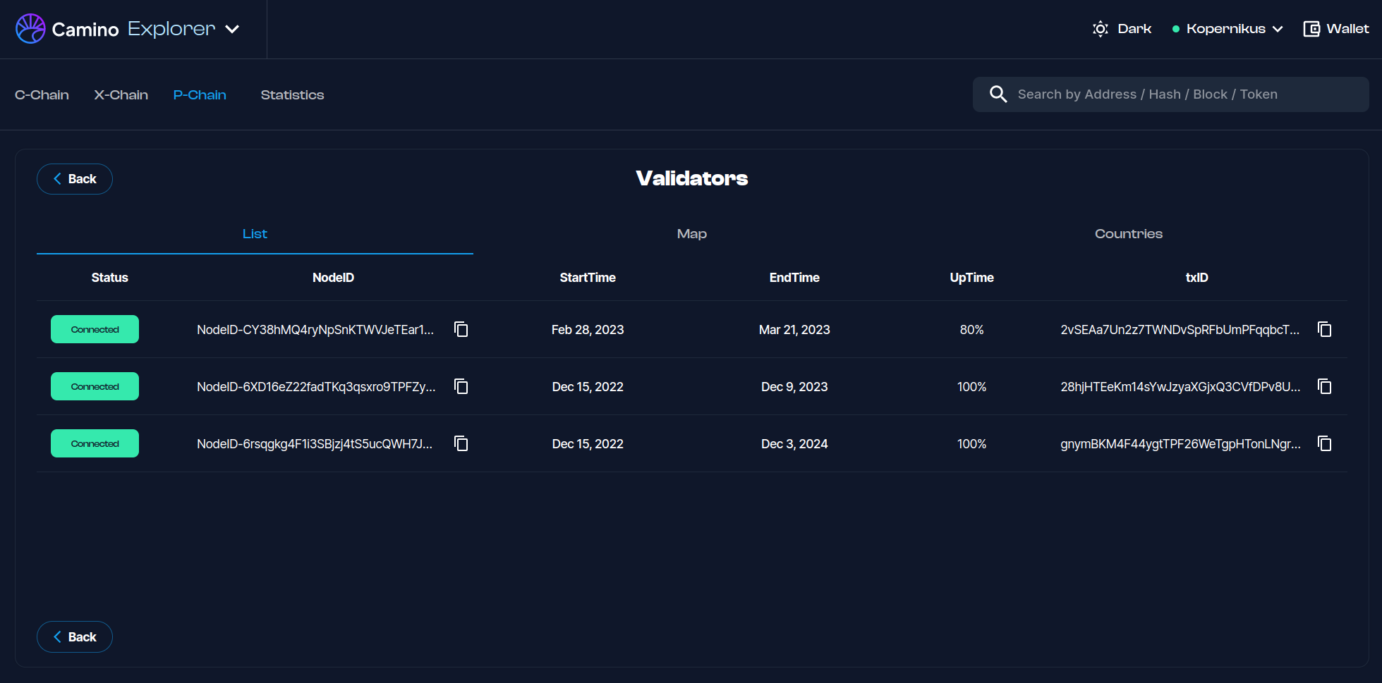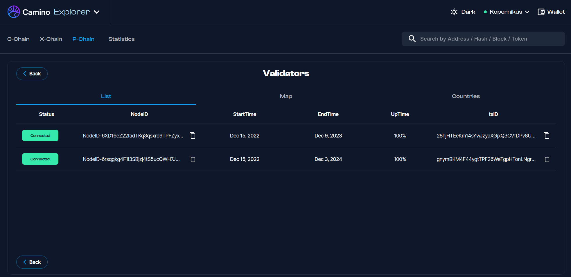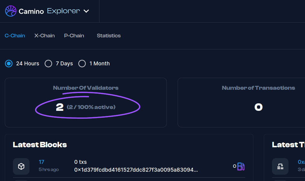To access the Validators List, click on the "Number of Validators" on the Camino Explorer: