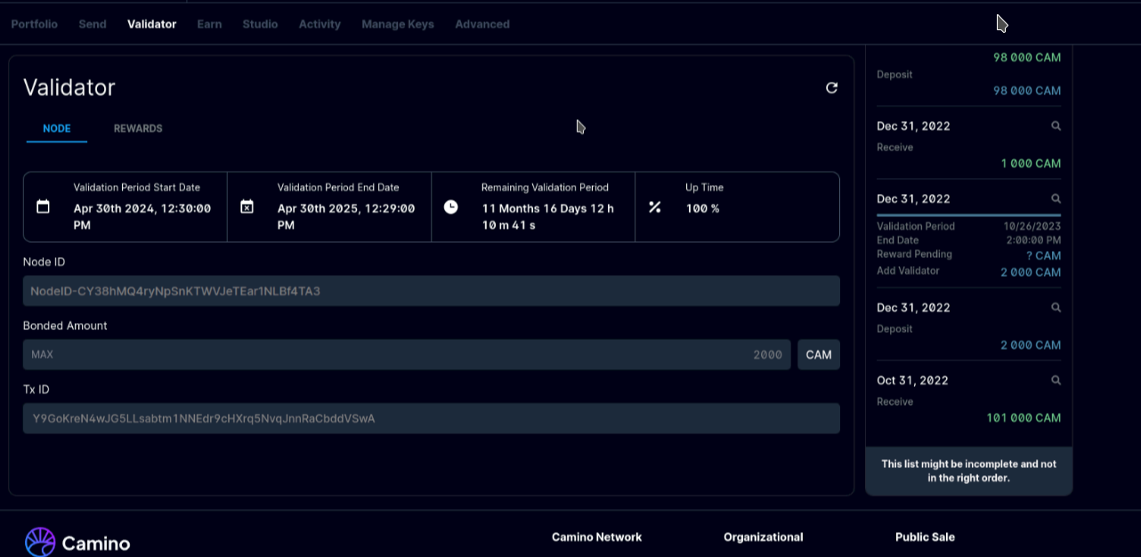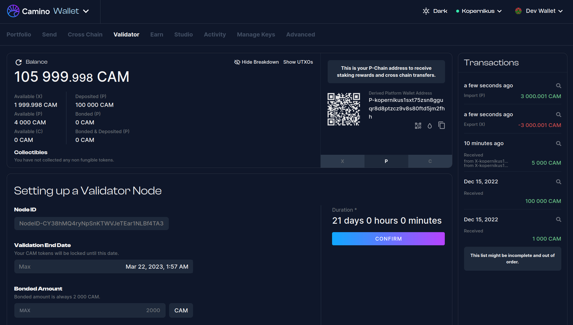 Keep it safe and secure! - 100,000 non-bonded CAMs in your P-Chain wallet. And a few CAMs for paying for transaction fees.