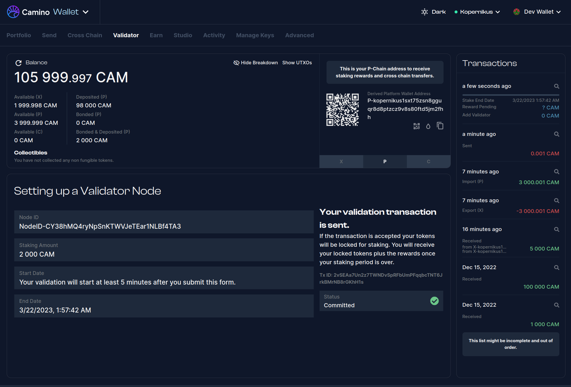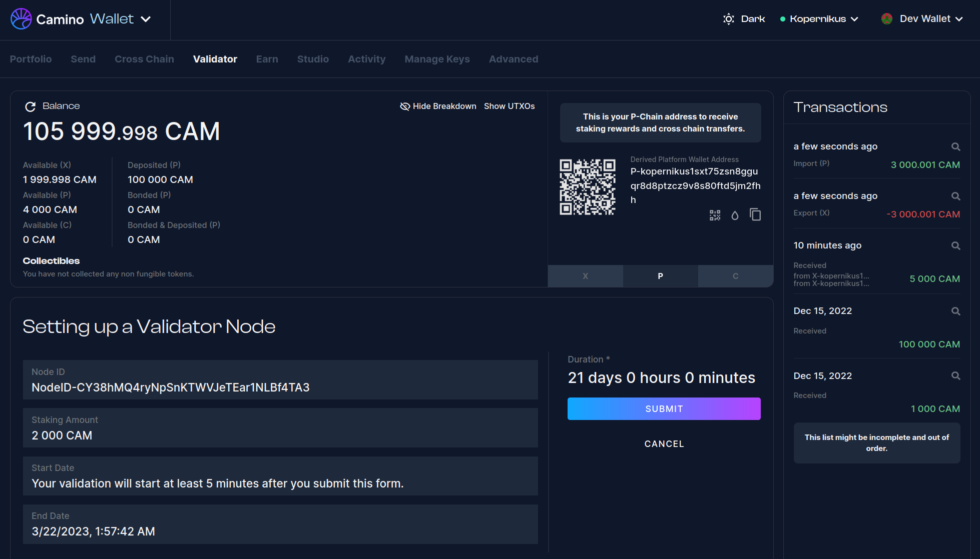 To add a validator node with Camino Wallet, you will need to follow the steps below: