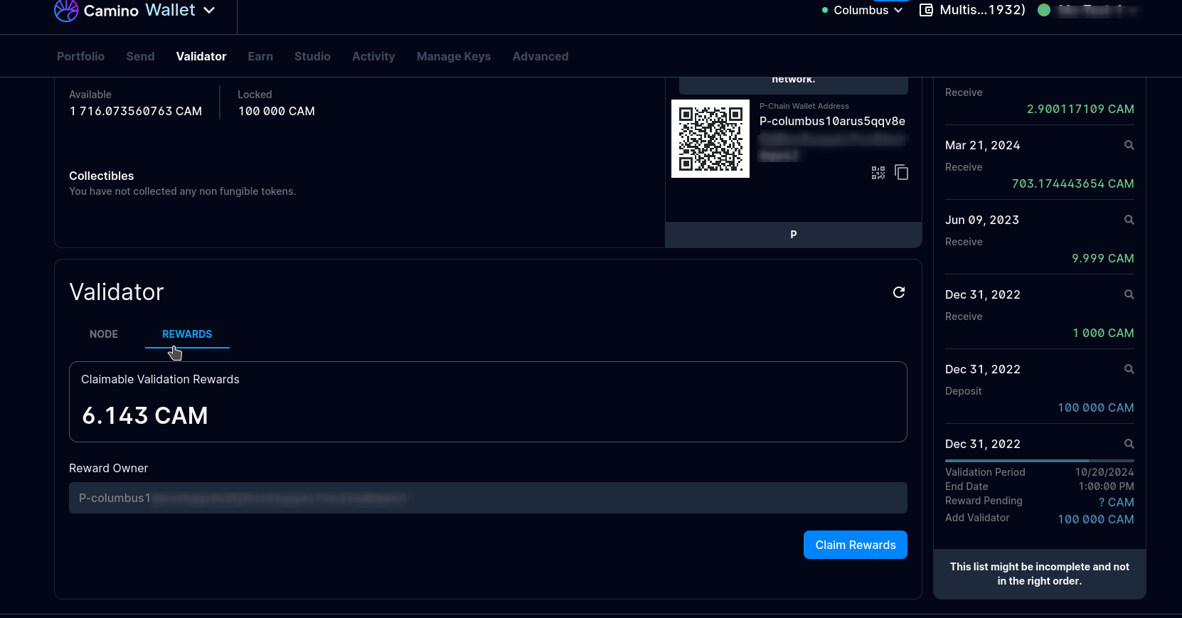 You can also check Validator Rewards on Camino Wallet in the Rewards section in Validator tab: